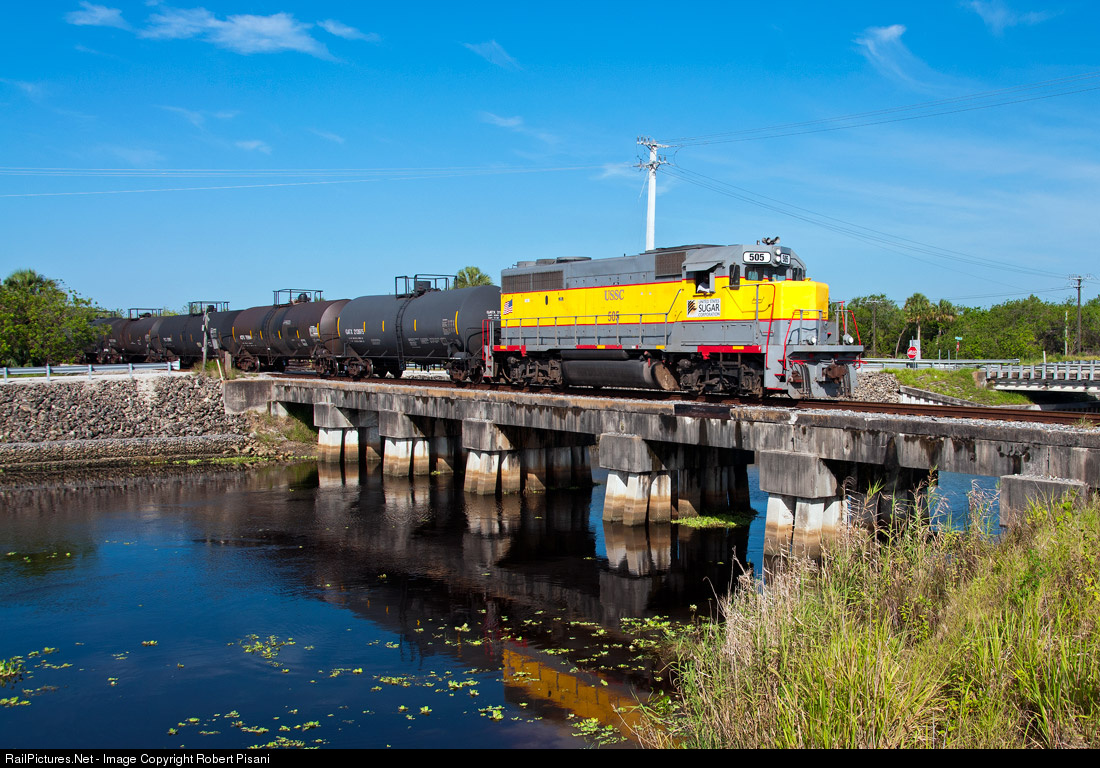 | The South Central Florida Express turn to Fort Pierce heads east across a canal in rural western Port St. Lucie. This train is running over Florida East Coast's K Branch and will soon arrive at Fort Pierce Yard Yard to interchange cars with FEC. |