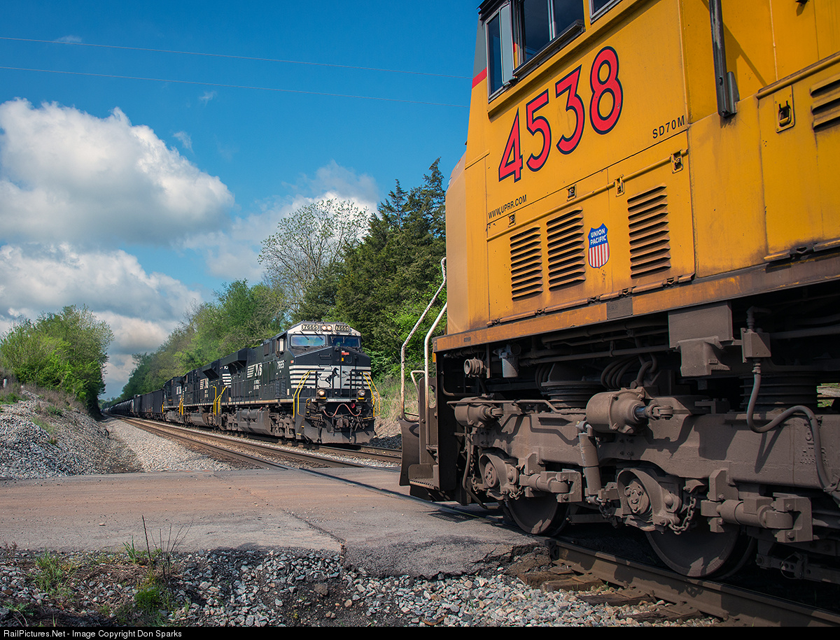NS ES44DC 7665 eastbound meets westbound UP SD70M 4538 at Hodges in the community of Strawberry Plains, TN.