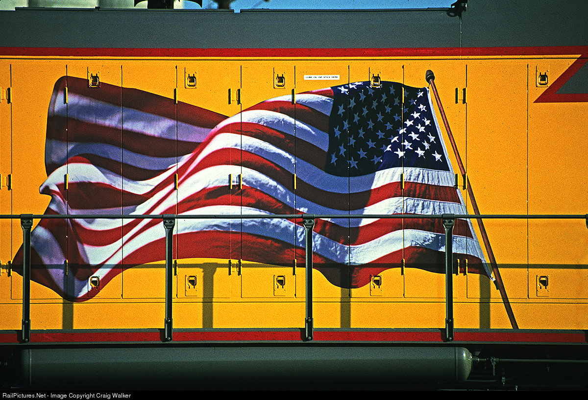 As the Twentieth Century was winding down, the Union Pacific announced in 1999 the first major changes to their staid Armour Yellow and Harbor Mist Gray paint scheme, introduced on their E6 passenger diesels in 1940: A "lightning stripe" zig-zag (reminiscent of Chicago & North Western's Dash 9-44CW/AC4400CW paint scheme) was added to the upper red stripe and, more boldly, the "winged-shield" nose medallion, found on the railroad's old passenger power, to the noses of an upcoming order of 1000 SD70M diesels. New SD70Ms delivered in May 2000 featured these changes, with the return of the wings on the noses being a very welcome addition to what had become a very bland face on engines that had the North American Safety Cabs. And that was just the beginning, as on November 16th, 2001, the railroad added an American flag to the hood, in place of the large Union Pacific roadname, along with a small "Building America" slogan. These were applied to SD70M 4526, 4527 and 4528 in memory of the tragic events of September 11th, 2001. At first many believed that these three engines would be the only units so decorated, similar to the way many railroads (but, curiously, not UP) would paint one, or a handful, of locomotive in patriotic colors to commemorate the American Bicentennial in the mid-1970s. But with thousands of UP diesels roaming the system today, we now know that these three were just the originators of the scheme. These three remained unique, however, as the flag applied to their flanks differs from that applied to the rest - the blue field is smaller than one would expect, the pole to which the flag is attached is wooden (rather than metal) and the waving shape is different and includes some motion blur on the outer edge. (Commerce, California – November 18, 2001)
