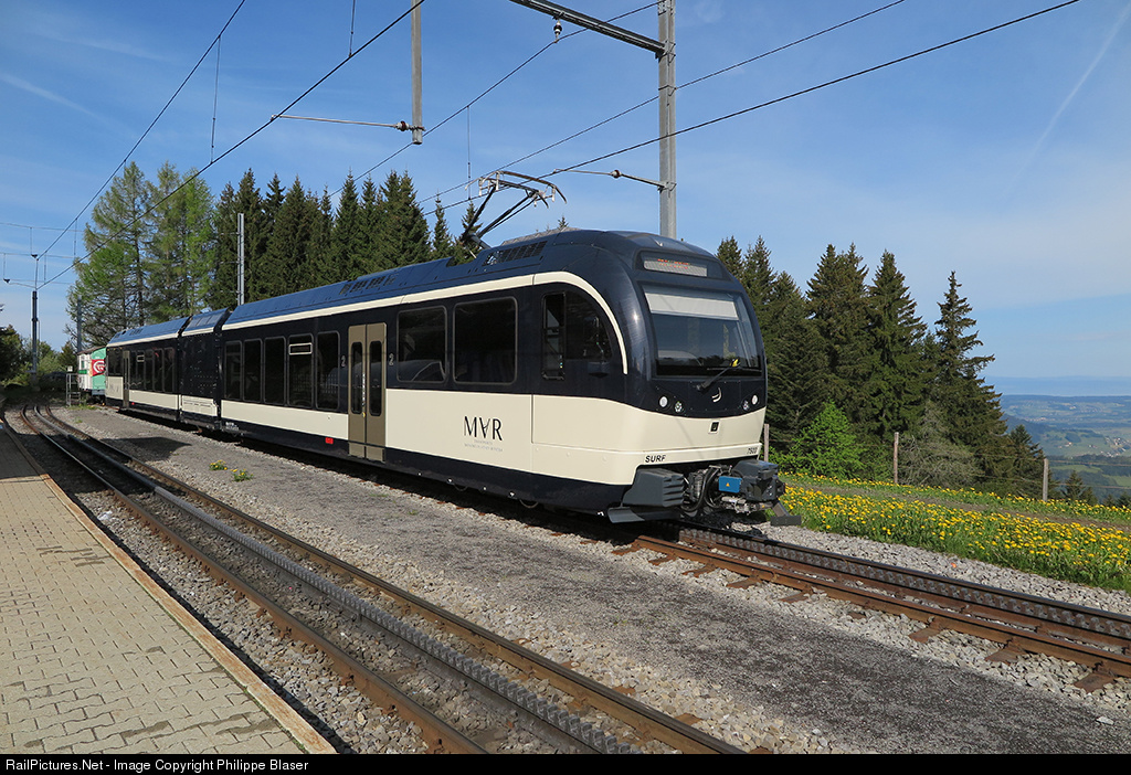 MVR (Montreux - Vevey - Riviera) EMU ABeh 2/6 7503 just arrived at the station Les Pléiades (1348 meters over sea level) with a special train. Les Pléiades is the endstation of the 10.5km long line from Vevey. The last 5km from Blonay (620 meters over sea level) to Les Pléiades is the train climping up with cograils system Abt.