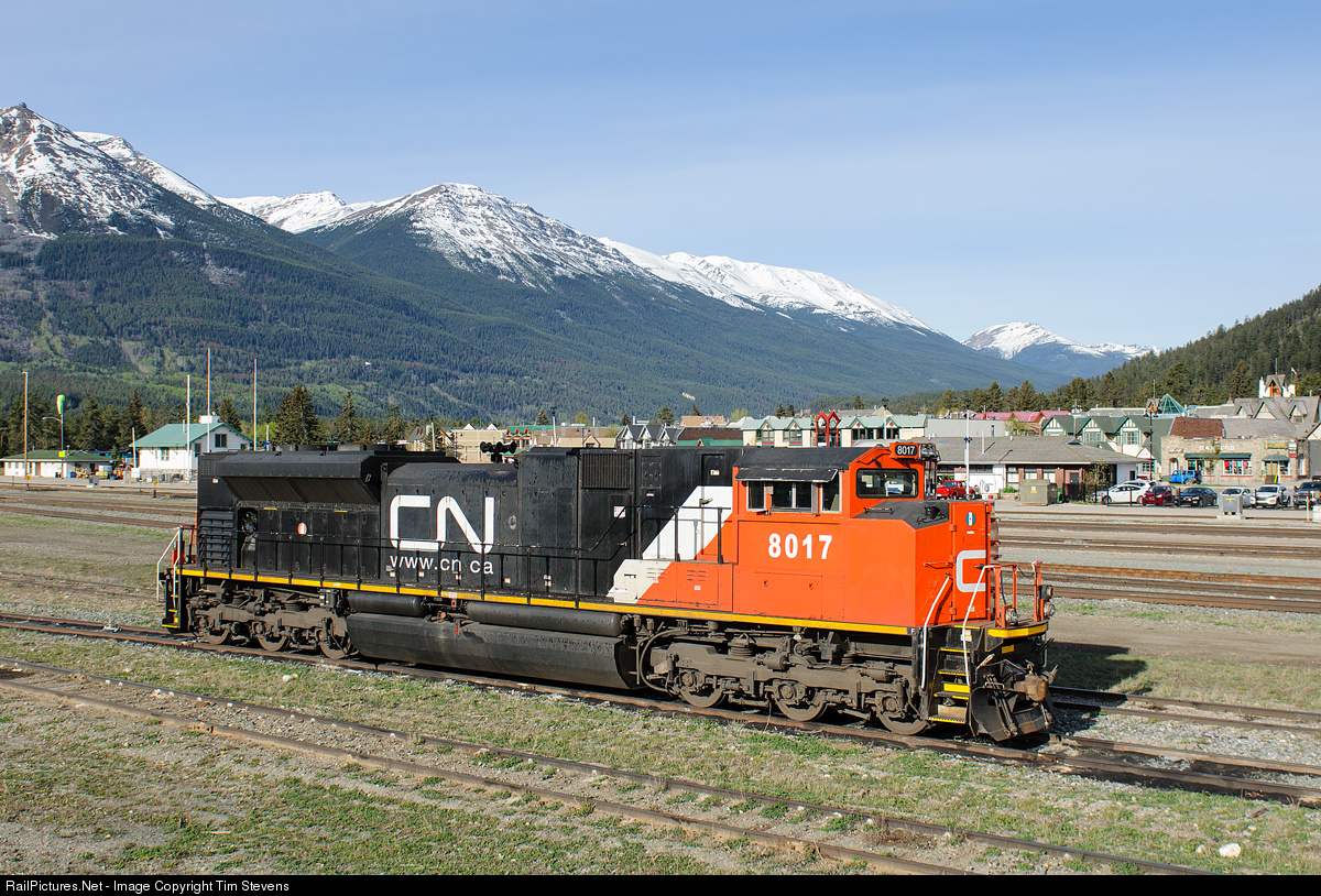 | With the downturn in traffic, CN has decided to park SSV (stored serviceable) units at many of their terminals to protect potential power failures that happen on the road. CN SD70M-2 8017 was one of two SSV units at Jasper on this day. |