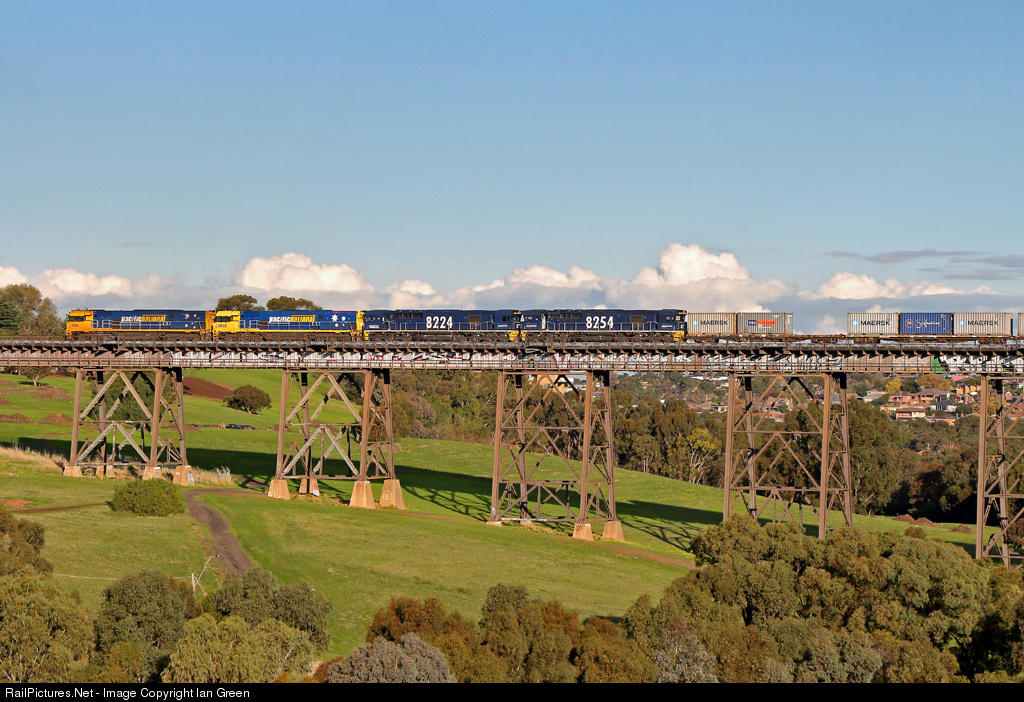 NR6-NR60-8224-8254 work 6MC2 freight across the Moonee Ponds Creek viaduct near Glenroy.