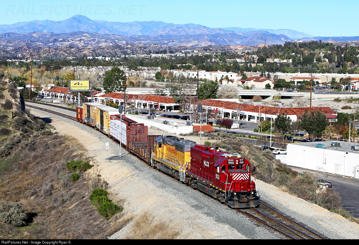 With the communities of Valencia and Santa Clarita in the background Union Pacific's westbound Saugus local rattles the switch at CP Canyon just west of where SP's Saugus Station, the line's namesake, was located. Originally built by the Southern Pacific Railroad in 1876 to complete the link between northern and southern California, today the 'Saugus Line' is owned by Southern California's Metrolink as their Valley Subdivision. Power on the Saugus includes HLCX 1032 (of Illinois Central heritage) and UP 1374 (of Southern Pacific heritage). On the drawbar are three loads bound for Weyerhaeuser Building Supplies in Via Princessa, one load for Phillip's Plywood in San Fernando, and the Saugus' shoving platform SP 4612.