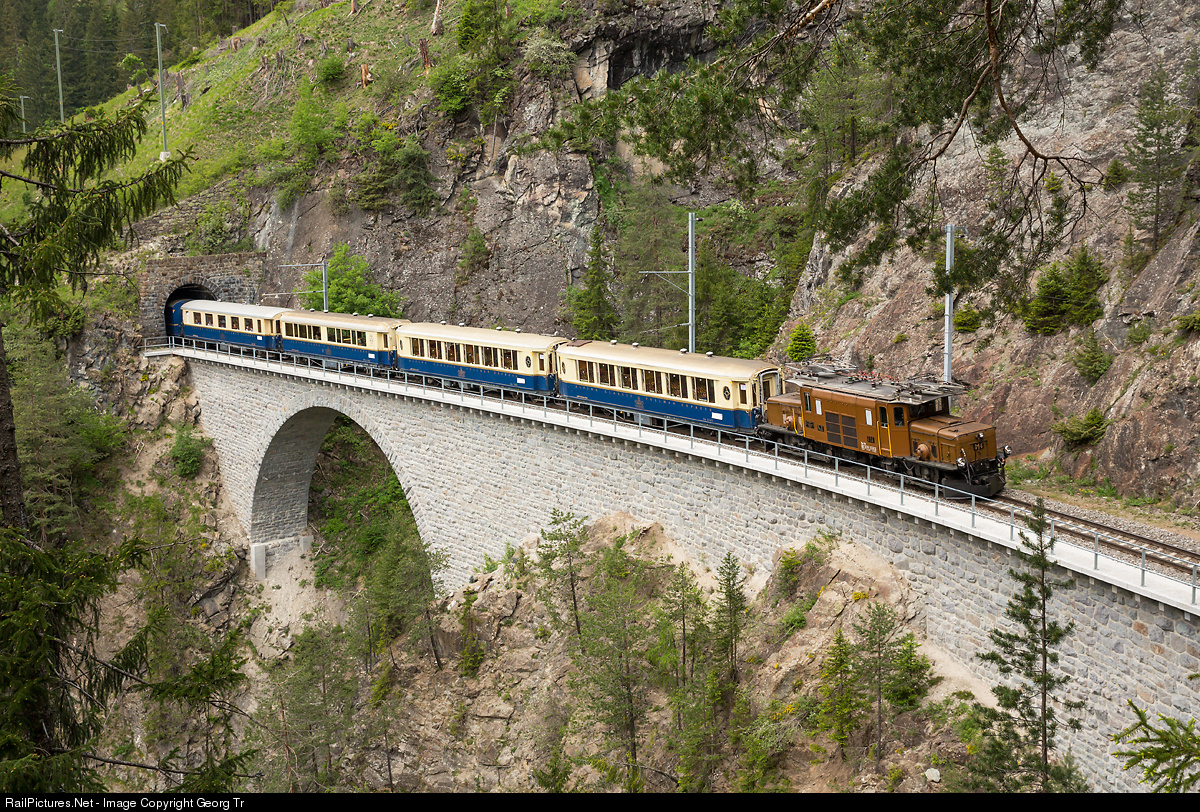 "Rhaetian Crocodile" Ge 6/6 I (or "CC") # 414 is pulling a charter train with saloon (parlor) and dining cars over the Stulsertobel bridge between Filisur and Bergün. The cars are the following: Saloon cars As # 1141, 1142, Piano/Bar WR-S # 3820, As # 1161, Diner WR # 3810, 3812.
