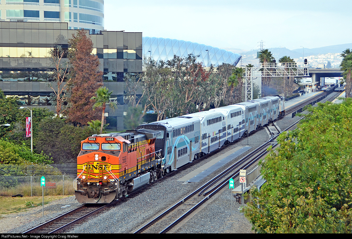 Metrolink train 667, heading from Oceanside to Los Angeles, departs the Anaheim Regional Transportation Intermodal Center (ARTIC), the large silvery building that looks like an armadillo in the distance. Because Metrolink doesn't fully trust their relatively new Hyundai Rotem cab cars, they have leased, at great expense, a batch of BNSF AC4400CW diesels to operate on the cab car end of most of their trains. On May 28th, 2016, BNSF 5668 is leading this train, which was running late due to a bad grade crossing in San Clemente and "cascading problems" elsewhere.