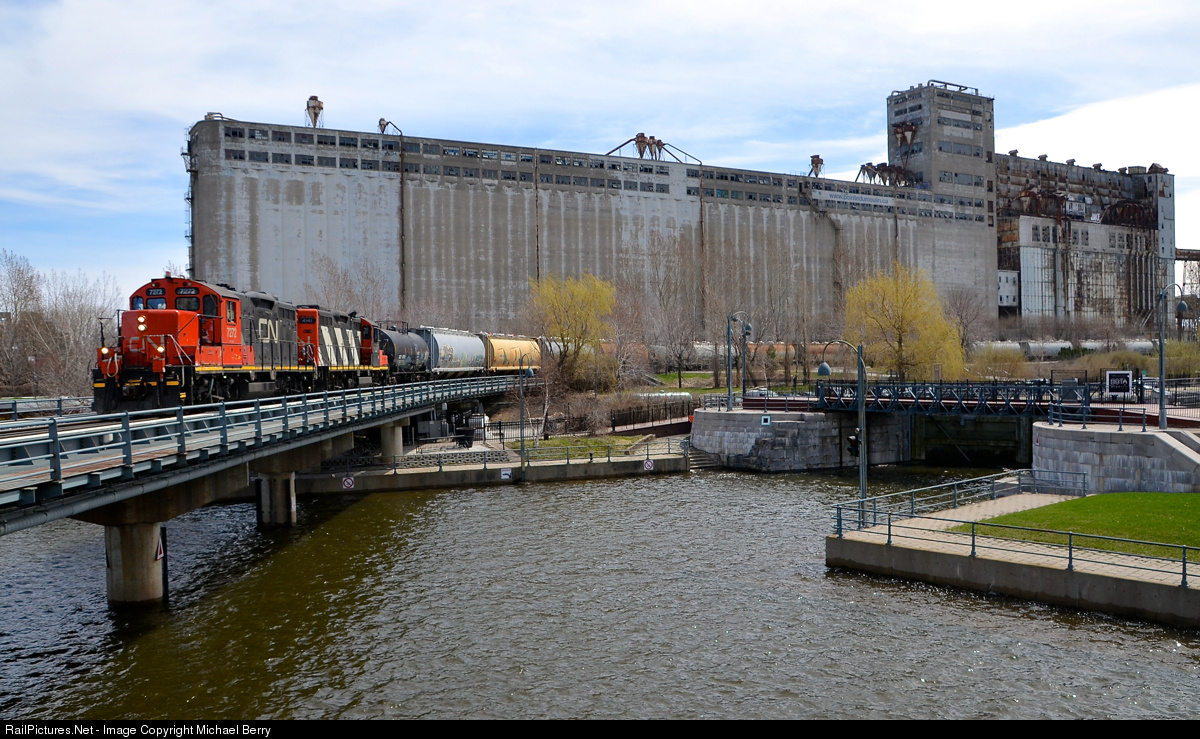 | In front of grain elevator #5. The Pointe St-Charles switcher is stopped over the Lachine canal in Montreal, as it awaits Port of Montreal security to arrive and flag the crossings through this busy area. Power is a pair of GP9's (CN 7272 & CN 4141) and the train has about 15 cars in tow. In the background at right is part of the massive grain elevator #5. |