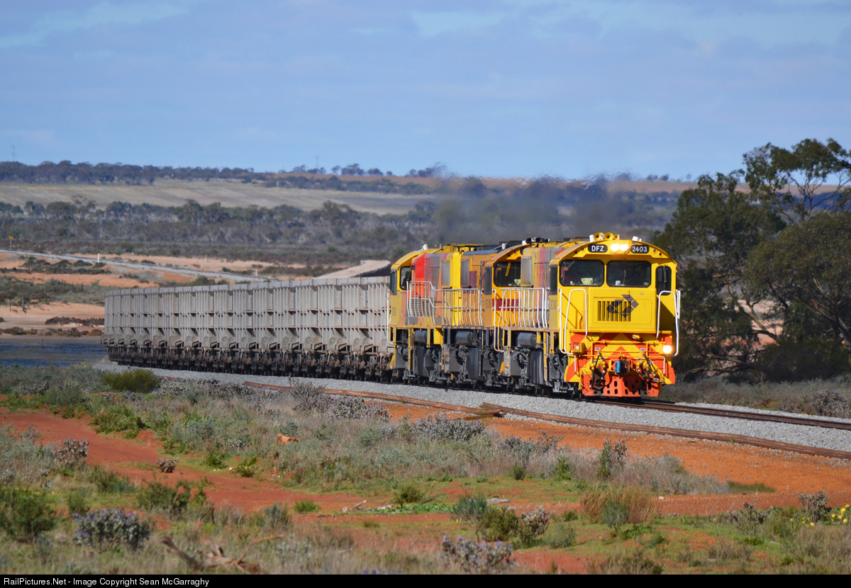 | DFZ2403, DFZ2405 & DFZ2402 work a Karara Mining iron ore train 1763 just south of Morowa on the salt flats on a chilly winters day. KML had then recently started trucking ore to Perenjori to be loaded on trains and then be transported to Geraldton. Aurizon then diverted one of their KML ore trains from Karara to Perenjori each day for loading using older EMD power. |