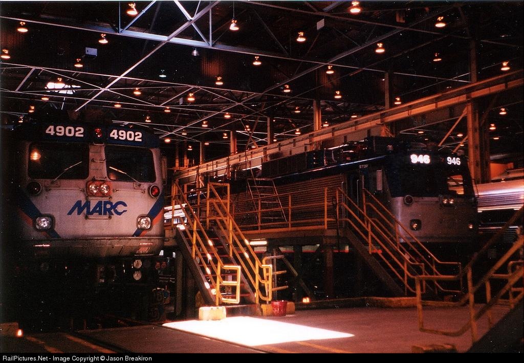 MARC 4902 & Amtk 946 sit in the inspection area in Amtrak's Ivy city Shops during a recent NHRS Tour.
