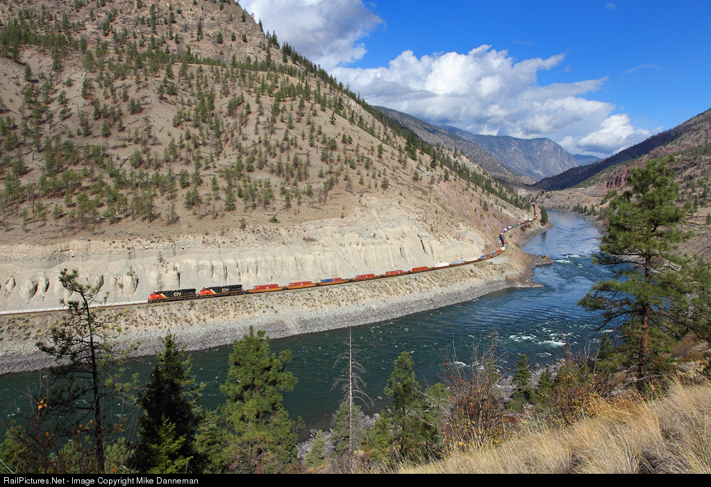 | Canadian National train No. 101 follows the rugged shoreline of the Thompson River west of Seddall, British Columbia, on September 26, 2015. |