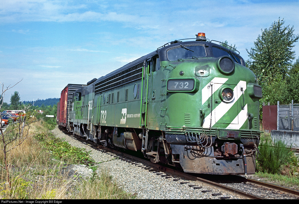 Locos 732 and 1632 betray their NP heritage (NP 6014A built May 1951; NP 558 built March 1952 respectively) on the Maltby Turn at Bellevue, WA. The crew stopped here for a lunch break before continuing south to Renton and Auburn Yard, located between Seattle and Tacoma. Hard to believe this F7 was born the same month I was.