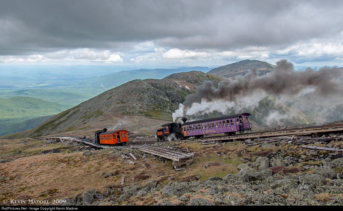Meeting on the Mountain. After dealing with a minor derailment at Skyline Switch, MWRC #9 and her orange coach are safely in the hole, allowing MWRC #2 and her 11AM Train to proceed to the summit. In the hey-day of steam operations on the Mt. Washington Railway, meets such as this one were commonplace. The single-track railroad had a couple of spur tracks to allow ascending trains to pass descending trains. One was located at Waumbek Tank, about 1/3rd of the way up the hill and the second was this one, at Skyline, about 2/3rds of the way to the top and 5,600 ft of elevation. Typically, the descending trains would take the siding and give way to the trains headed for the summit. During peak fall foliage season, there were often multiple sections on the hourly trains, and that meant these sidings had to be built to accommodate multiple trains. Historic photos show four or more trains congregating here. Alas, photos of mountain steam meets like this one are just no longer possible. Since the line dieselized in mid-2009, the fleet of active steam locomotives has diminished from 7 down to just 2, and you'll virtually never see more than one in operation at any time. In addition, the switch and spur track you see here are no more. The only passing facilities left are at Waumbek tank and the summit. The speed with which the new diesel-hydraulics can make the summit means that there are just fewer trains on the line at any particular time.