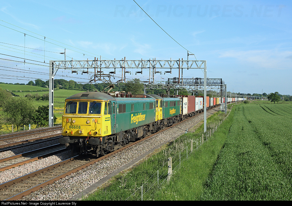 | 86608 & 86638 approach Stableford whilst working 4M87, 1113 Felixstowe North FLT-Trafford Park Freightliner, 2 June 2016.