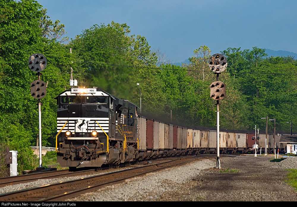 Loaded coal train Y90 heads east splitting the PPL's at Hunt on Memorial Day with NS 1166 on the point.
