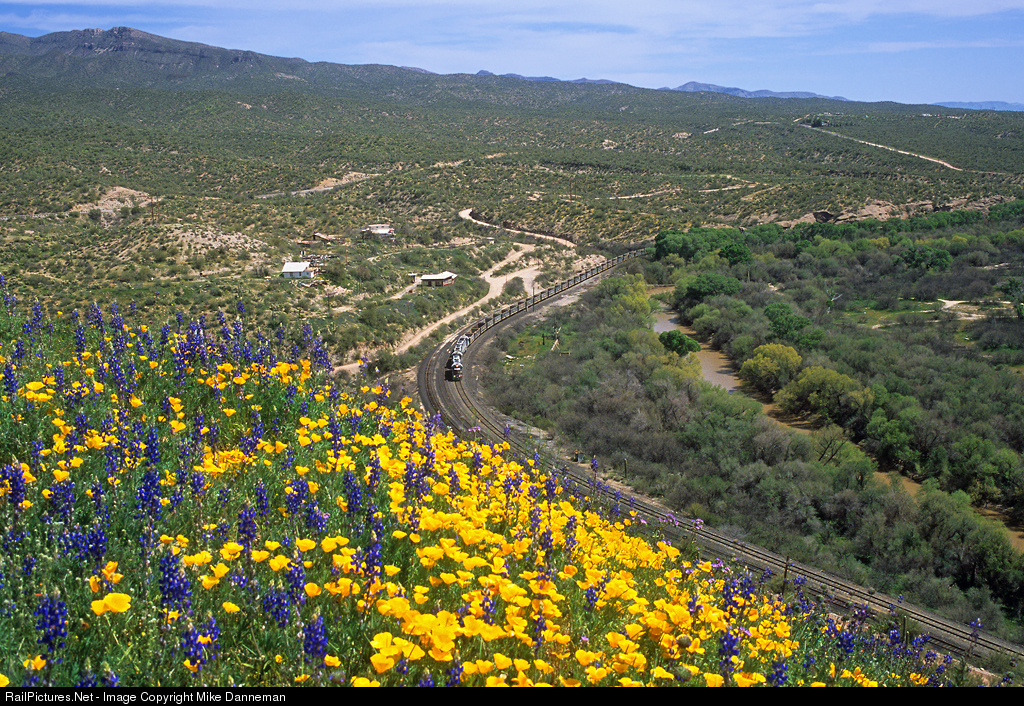 On the early spring day of March 29, 2010, Copper Basin Railway’s empty ore train No. OT-2 curves through Ray Junction. The Gila River is running brown with runoff and wildflowers are sprouting in the high desert around Ray on this beautiful afternoon in Arizona.