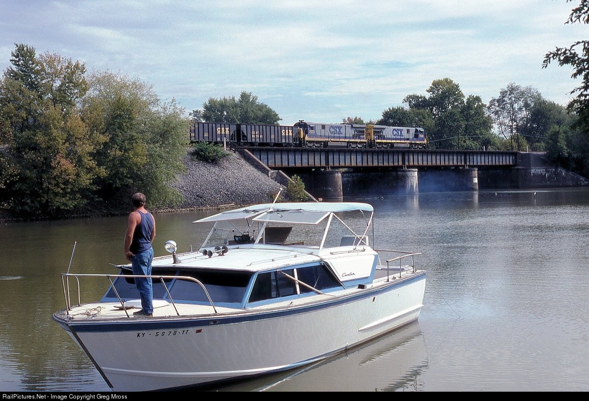 | CSX 7030 leads a southbound coal train across the Sandy River in Greenup, KY under the watchful eye of a vintage cabin cruiser. |