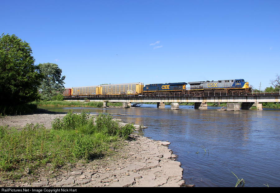 On a sunny afternoon in Lemont, CSX AC6000CW 692 leads a westbound vehicle train over the Des Plaines River in Lemont.