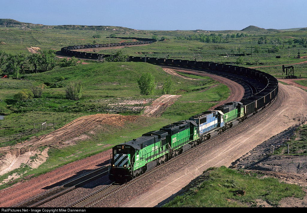 Swinging through three curves, a loaded coal train approaches Donkey Creek, Wyoming, on May 29, 1998. This early BNSF train is powered by three Burlington Northern locomotives (GE C30-7, EMD SD40-2 and SD60M) joined by a leased Oakway SD60. DPU power is a thing of the futureā¦
