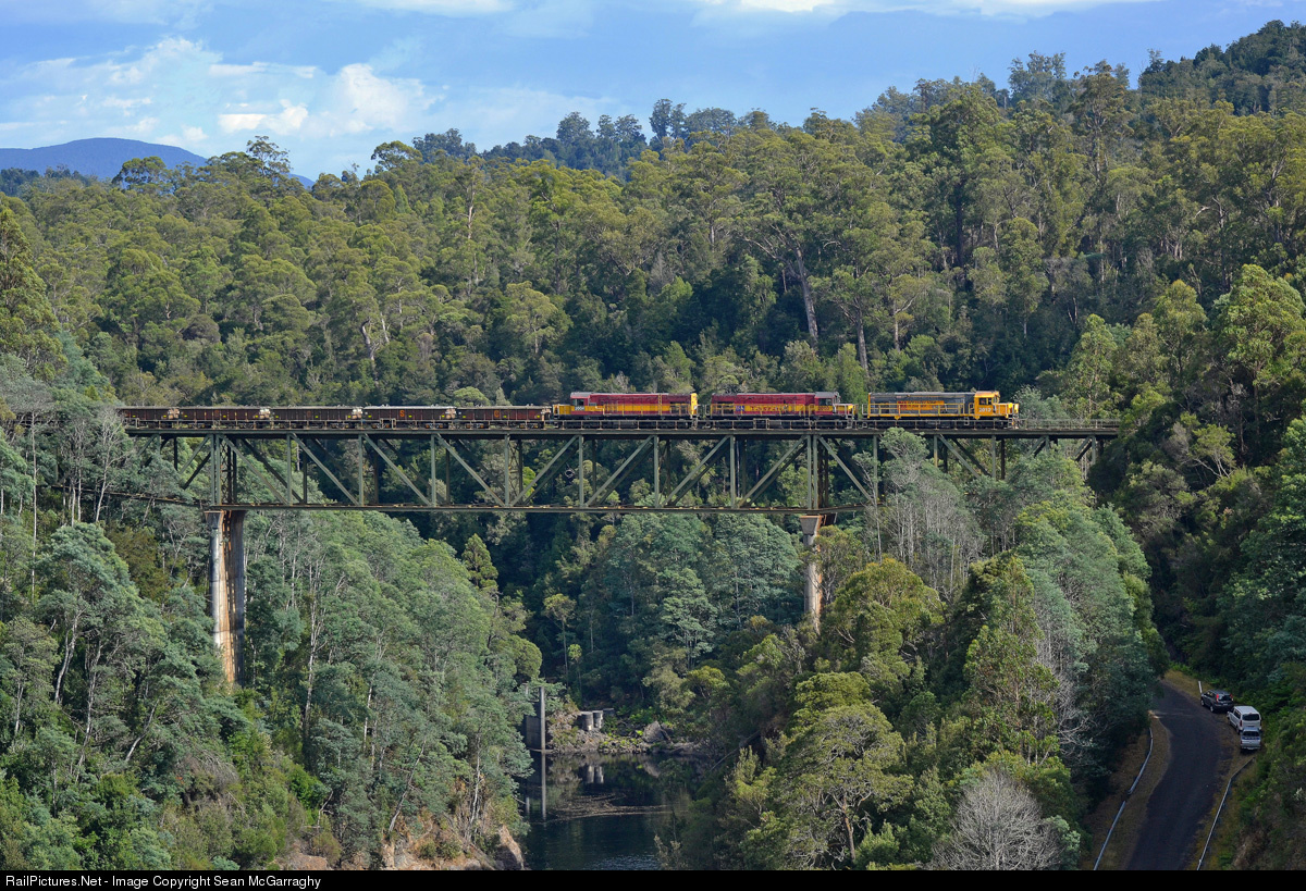 Having departed not too long beforehand from Primrose siding in Rosebery, DQ2012, DQ2003 & DQ2004 traverse the Pieman River rail bridge on the old Emu Bay Railway with 372 loaded ore as seen from the wall of Bastyan Dam.