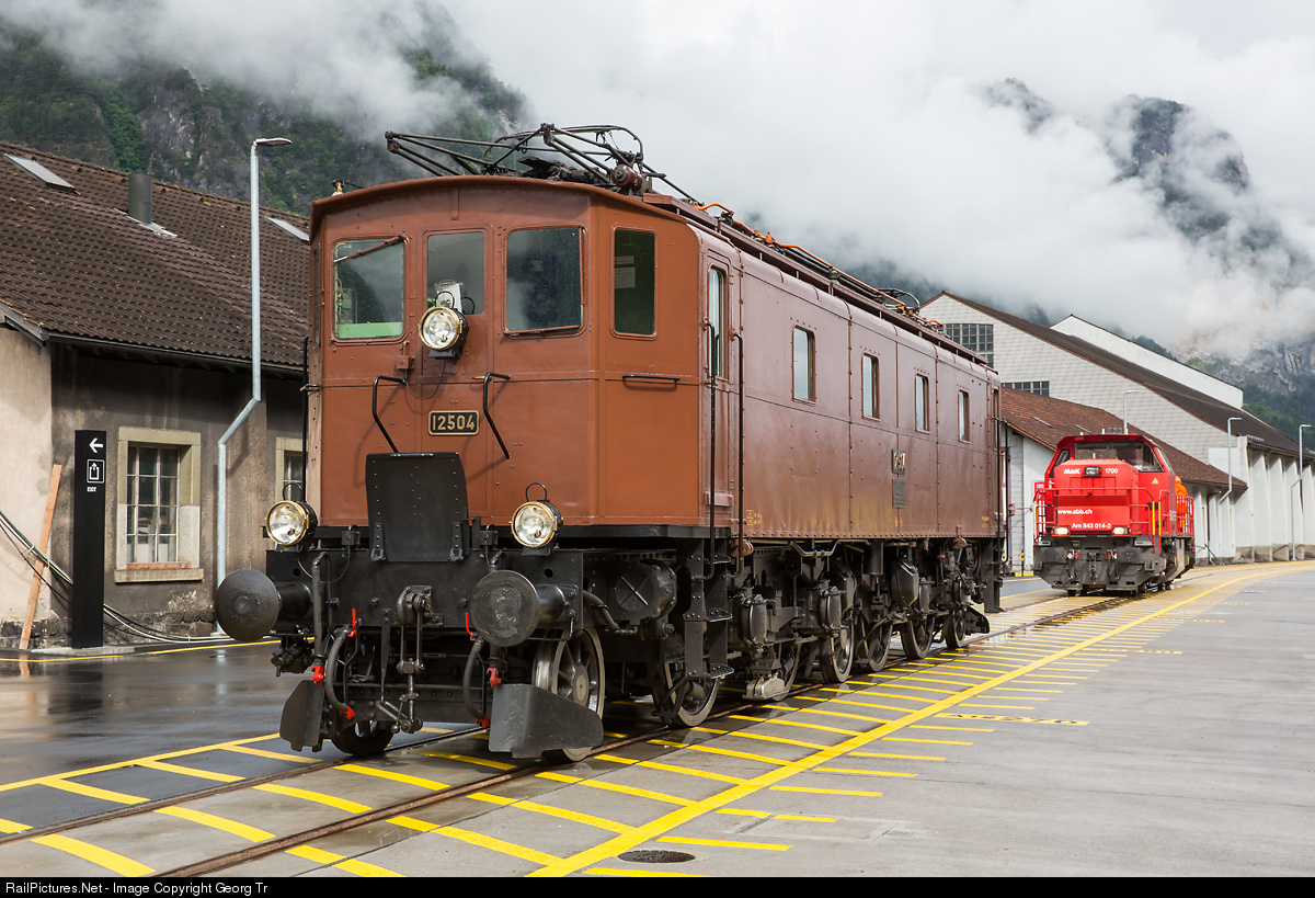 | Former Gotthard express train locomotive Be 4/7 # 12504 with Westinghouse/Sécheron single axle drive, built in 1922 by SLM and SAAS. The locomotive ran on the Gotthard line between 1923 and 1932, later it was in service in the western part of Switzerland from Berne and Biel. Historic vehicle since 1976. In total there were built 6 of this series only. In the background diesel locomotive Am 843 # 014 of SBB Infrastructure. |