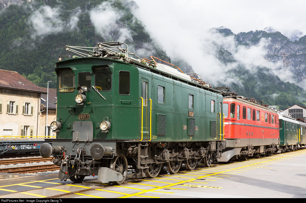 | Ae 3/5 # 10217 with a Westinghouse/Sécheron single axle drive was built in 1924 by SLM and SAAS for mixed service. It was in service in the western part of Switzerland, but some vehicles of the series of 26 (# 10201 to 10226) pulled the car transport trains through the Gotthard tunnel between Göschenen and Airolo. The locomotive came to Erstfeld this day for the exhibition on the occasion of the Gotthard Base Tunnel opening event. In the background Ae 6/6 # 11425 "Genève/Genf" and Re 4/4 I # 10001. |