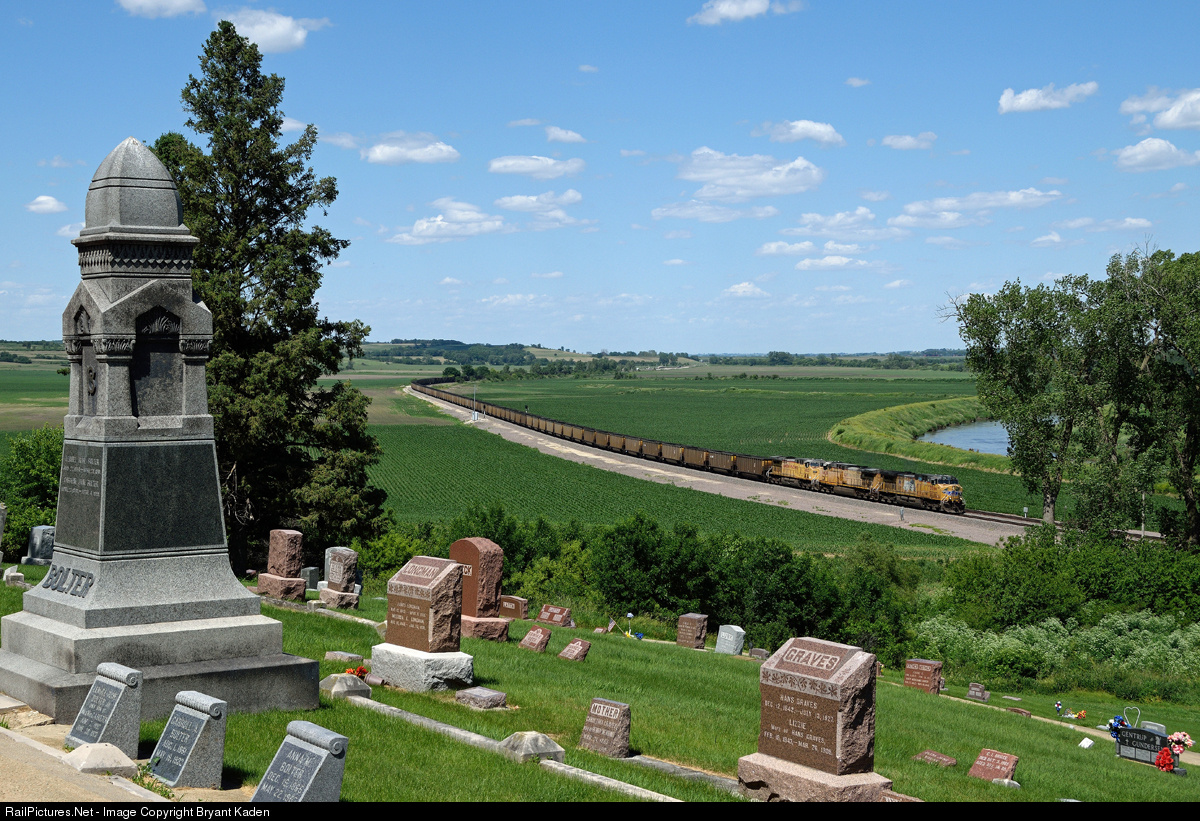 "Is this heaven?" Shoeless Joe might not mistake Logan for heaven since the Field of Dreams is on the other side of the state, but Iowa served up a heavenly afternoon for me as I kept company with some of the saints eternal and waited on a few trains. Traffic on the UP is of course way down, but I got a couple of westbounds in my time here, including this empty coal train with three GEs on the head end. Out of curiosity I looked up the person the large monument on the left belongs to. Lemuel Bolter it turns out was an interesting man. The grandson of a Revolutionary War soldier, Lemuel traveled overland from Michigan to California as a young man as part of the 1850s gold rush. He made some money before returning east to Michigan and then buying a farm here in Harrison County, Iowa. In addition to farming, he practiced law and was elected to the state legislature. He died on April 29, 1901 while serving as an Iowa state senator and died with the distinction of having served longer in the Iowa legislature as a representative and senator than any other citizen of the state at that time.