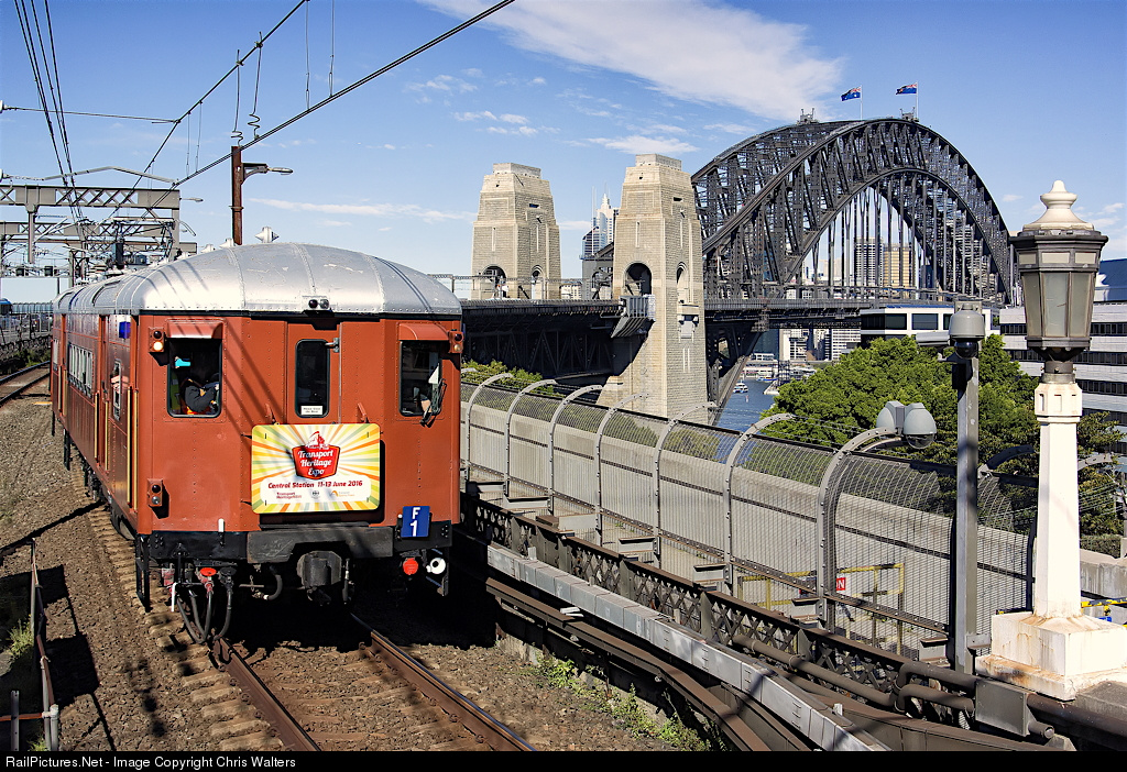 Heritage single-deck EMU set F1 (formed by cars C3426, T4527, C3218 and C7396) crosses the Sydney Harbour Bridge and enters Milsons Point Station en route to Lavender Bay Car Sidings for its media relaunch.