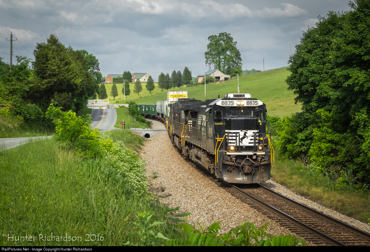 | As a storm approaches from the east, a standard cab C40-9 leads westbound intermodal train 201 through the countryside in Bluff City, Tennessee in the beginning of summer. The classic face of one of these units will become harder and harder in the coming months, as Norfolk Southern moves along with their program to convert these unique motors into AC44C6M's. |