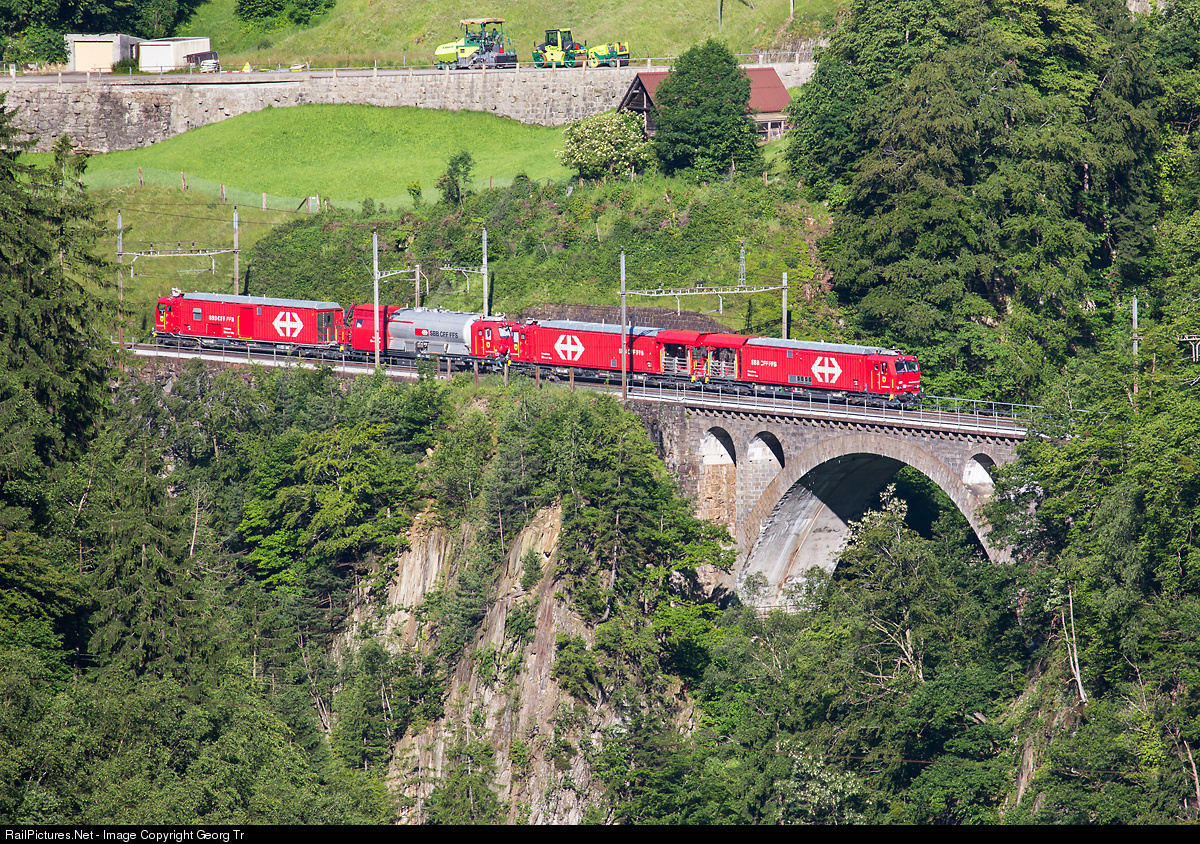 Fire fighting and rescue train "LRZ14" of Erstfeld is crossing the 40 meter long Intschialpbach bridge on the Gotthard north ramp during a training run from Gurtnellen to Flüelen.