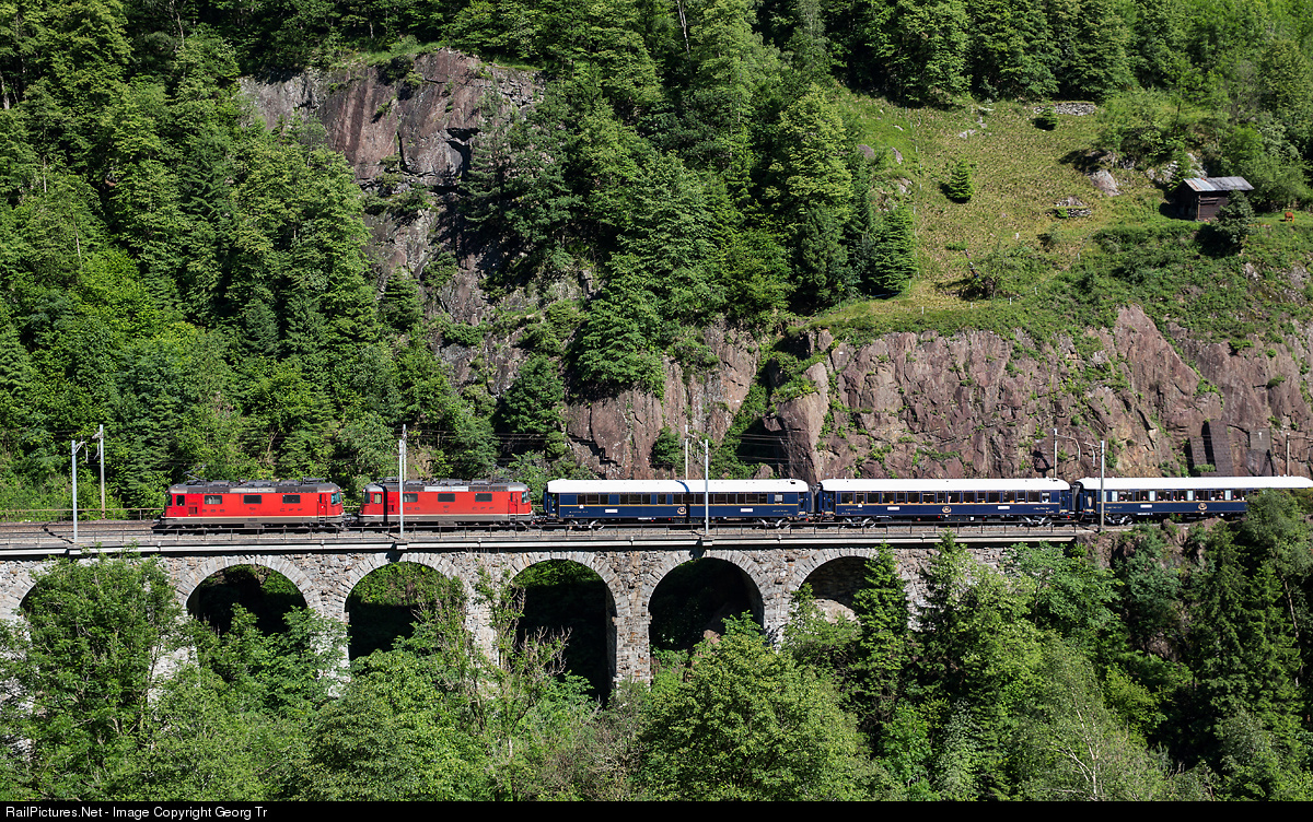 | Re 4/4 II # 11244 and 11157 are pulling the heavy 17 cars of the Venice Simplon-Orient-Express (VSOE) Calais-Paris-Basel-Chiasso-Venice over the 120 meter long Secken viaduct on the Gotthard north ramp. The viaduct is the only on the Gotthard mountain line, which is more or less in the appearance from when it was built (1880-1882). It got 10 instead of 6 bows when the line was double tracked in 1893. |