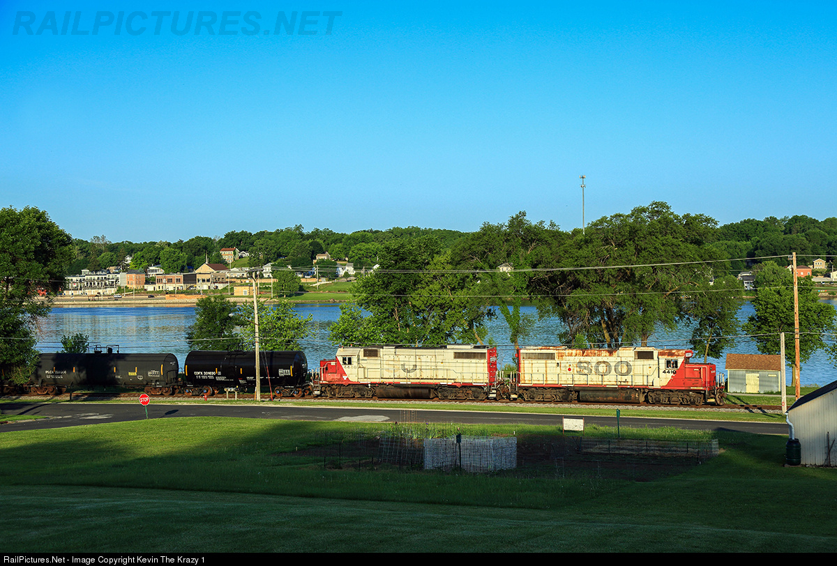 | CP's "Nitrin Job" heads north along the Mississippi River through the small town of Port Byron. Todays train hosts a pair of Soo Line GP38-2s and eight cars to serve the three industries just north of Cordova. The structure at the nose of the lead locomotive serves as a reminder of when the line was originally built in 1863 by the Warsaw, Rock Island & Galena Railroad. Le Claire, IA can also be seen across the Mississippi River. |