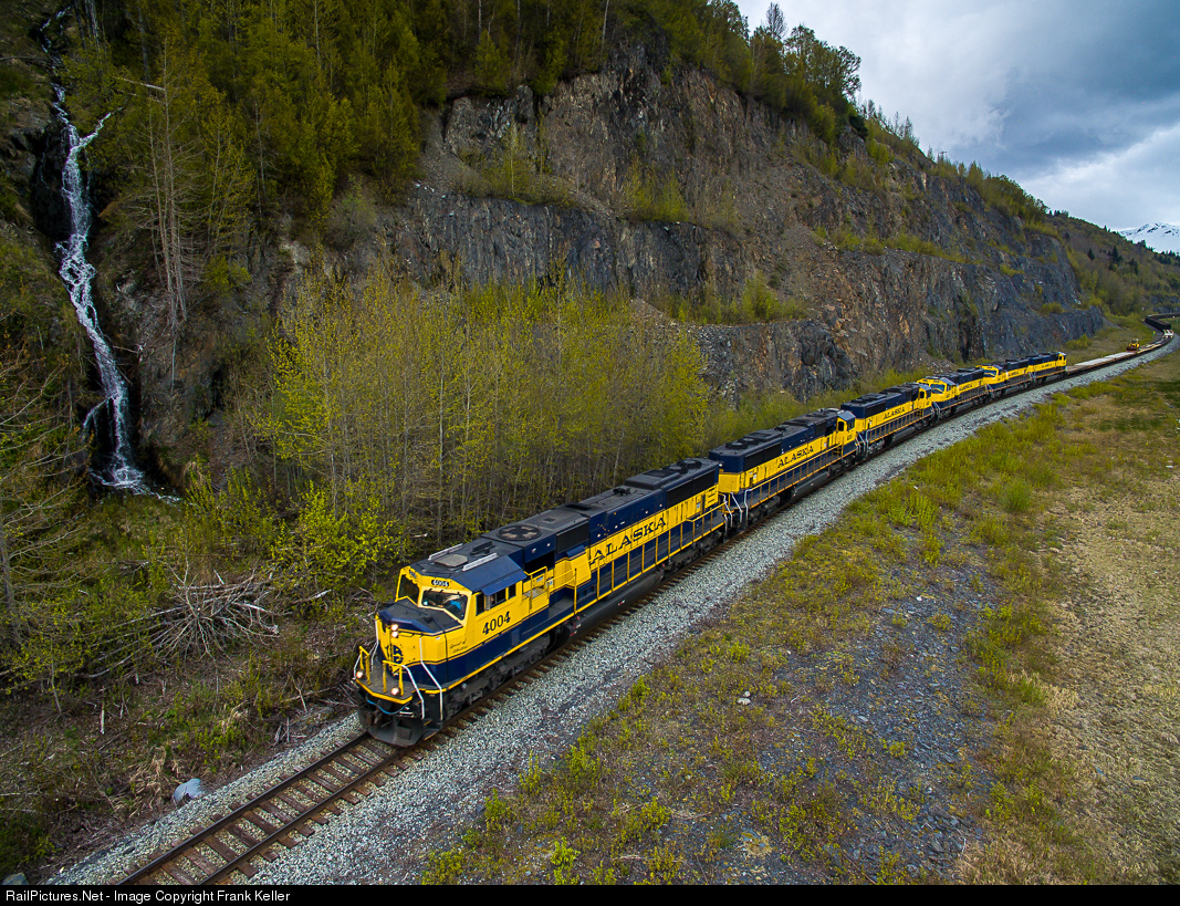 The empty coal train has some empty flats from Seward at the front of the train as they skirt Turnagain Arm and the numerous waterfalls en-route to Anchorage and the start of the next cycle.