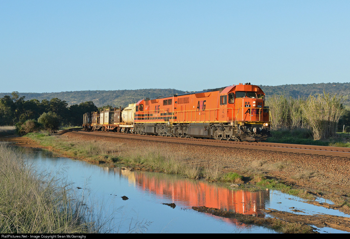 With plenty of recent rainfall at Brigadoon, LZ3114 & LZ3117 reflect nicely off a puddle as they work 5474 loaded salt train from Koolyanobbing to Kwinana.