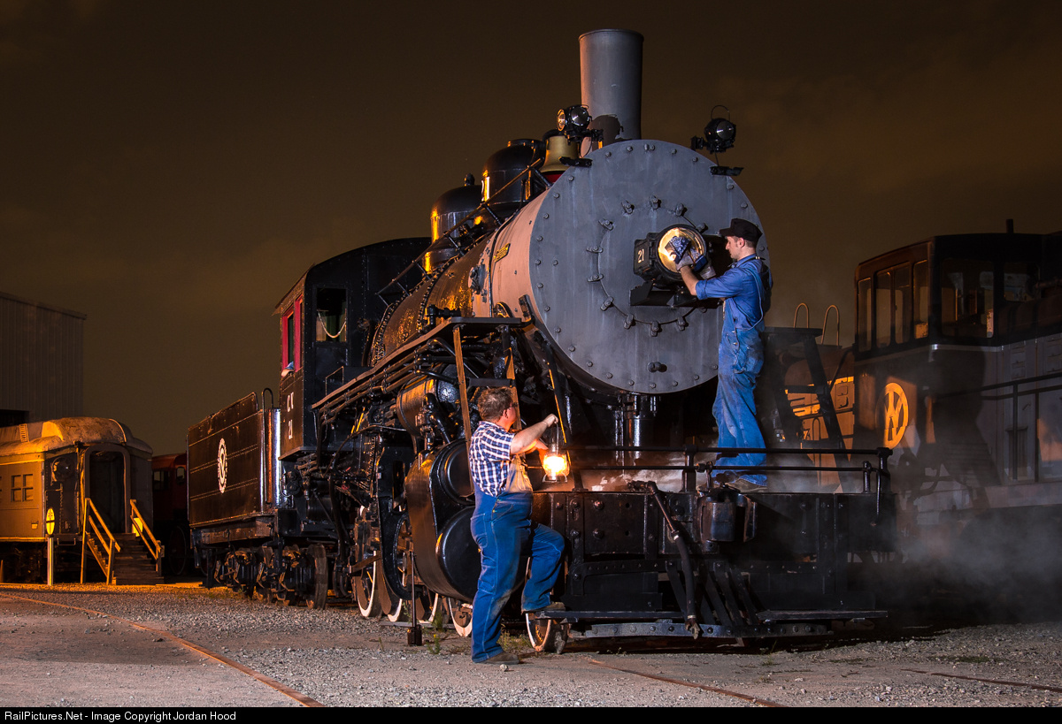 | Two Chattahoochee Valley Railway crew members tend to their engine as it simmers away after a long day's work. In reality, two of SRM's volunteers pose on the consolidation during a special night photo session for "Locomotive Celebration" 2016. For more information about the museum, visit http://www.srmduluth.org/ |
