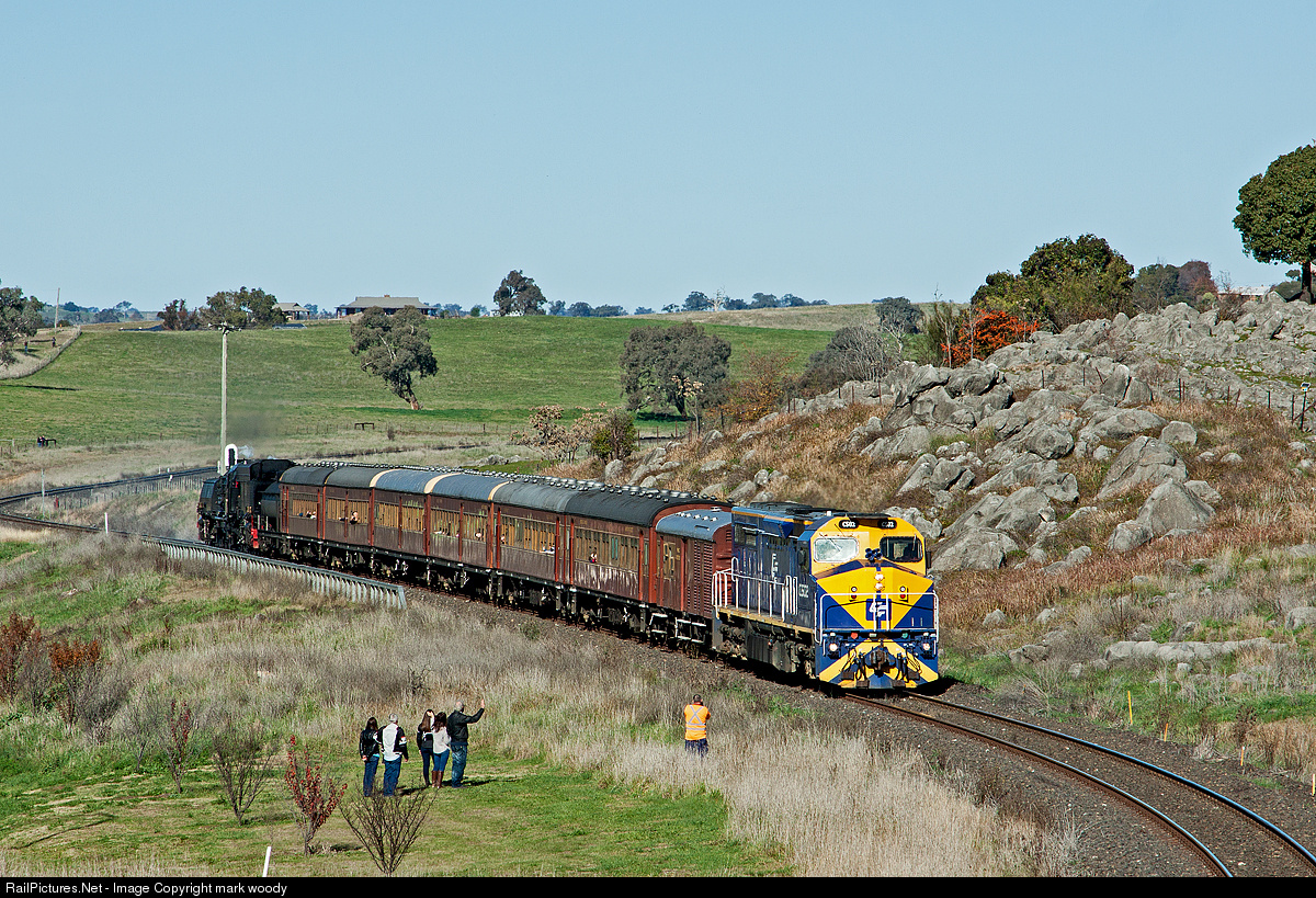 The diesel led leg of the Orange steam shuttle to Molong is seen just out of town, soon the steam return leg will be led by Garrett 6029 rolling along on the rear.