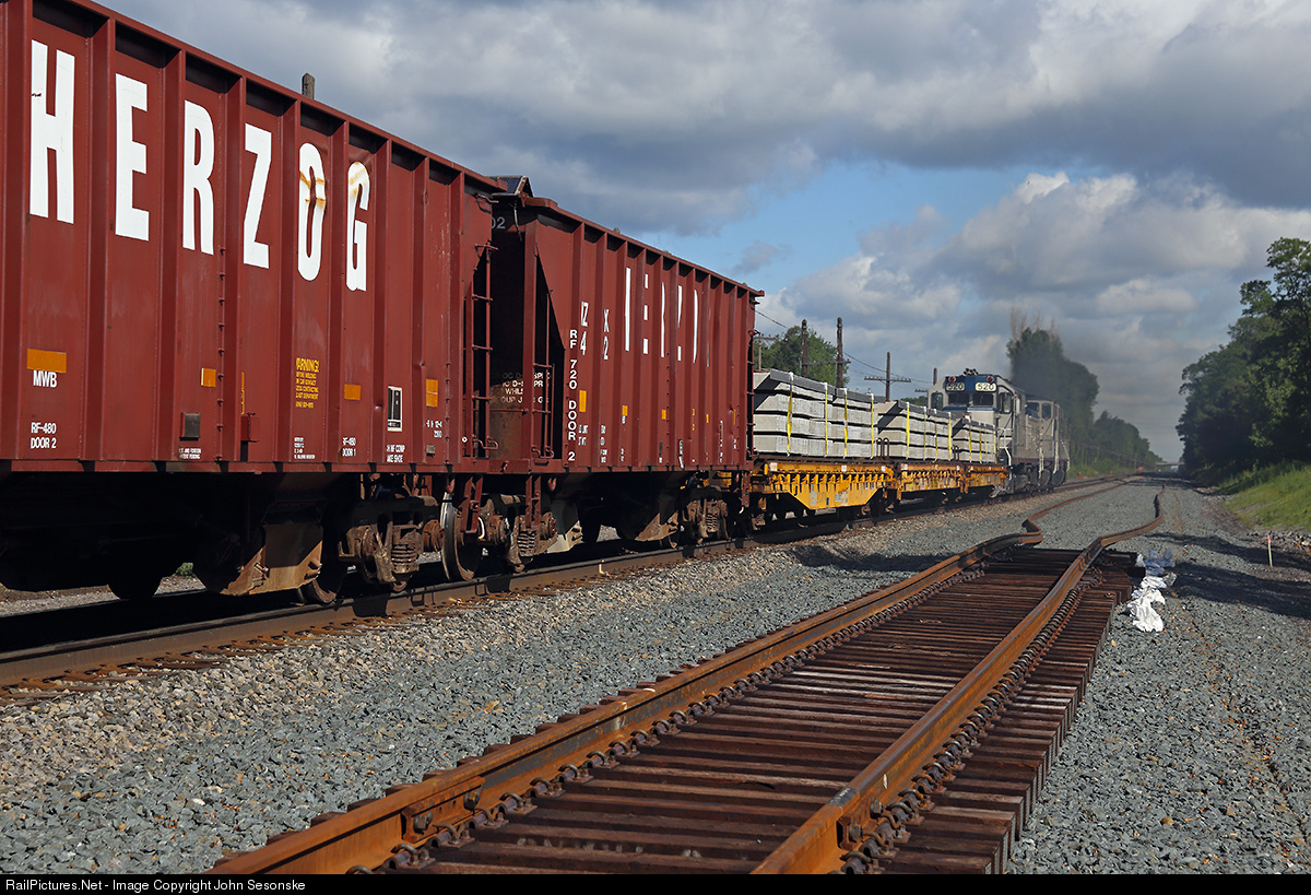 | Amtrak's construction of the second track between Albany and Schenectady is well underway now. A work extra with 3 units (MP15's # 531 & 535 plus 520) hauls 3 flat cars with concrete ties and 48 loads of stone WB towards Schenectady. In the foreground right is a section of the second track that has been built with wood ties on both sides of the Lincoln Ave crossing. Amtrak's TLM will arrive here in the near future to place concrete ties under the welded rail laid out into the distance. As of 6-12-2016, the second track is in place up to CP-146 in West Albany. When complete it will extend to CP-156. |