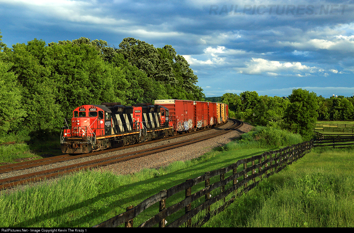 | The sun pokes out behind a summer storm as A pair of Canadian National GP9rm's sporting the Zebra Stipre paint scheme descend Byron Hill at Hamilton Rd. While most of the active GP9rm's are in the 7000 series, approximately 20 units in the 4000 series still sport the original zebra stripe scheme. |