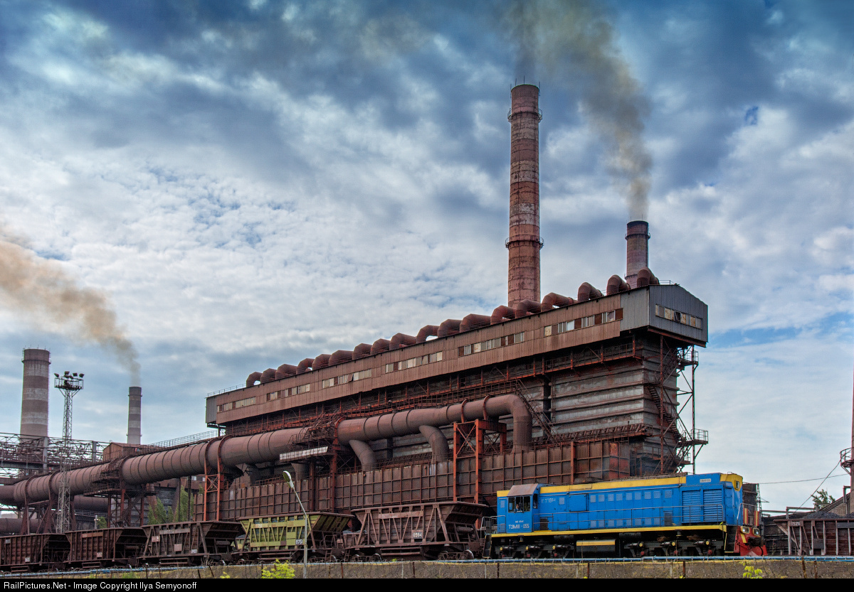 Russian steampunk. TEM2 diesel locomotive with ore cars. On the background you can see Ore concentrate plant of Novolipetsk Steel factory. "Novolipetsk Steel" or "NLMK", is one of the four largest steel companies in Russia. NLMK's share of domestic crude steel production is about 21%. It primary produces flat steel products, semi-finished steel products and electrical steels. NLMK also produces specialty coated steels, plus high-ductility and micro-alloyed steels.