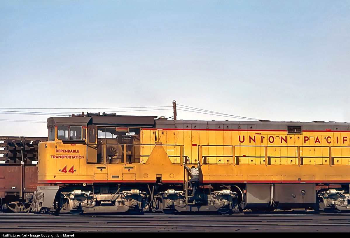 The worker sent out to attend to engine 44’s needs between runs must feel more like he’s boarding a ship than climbing onto a locomotive. Just how big is General Electric’s massive U50? At over 83.5 feet long and 15 feet 10.8 inches tall, UP’s 557,800-pound gorilla easily dominates the road’s Pullman engine facility in Denver between runs on October 16, 1966. The U50s are also the most powerful diesels anywhere, producing 160,000 pounds starting tractive effort, well above EMD’s competing DD35A, at 113,940 pounds, and Alco’s Century 855, which achieves 109,000 pounds.