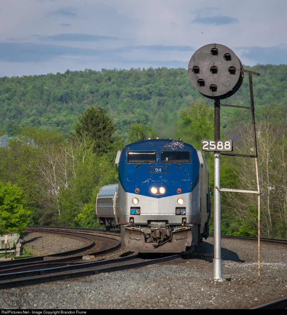 | Amtrak 07T (43), the westbound Pennsylvanian, passes the eastbound PRR position signals in Portage, PA with P42DC 94 leading. |