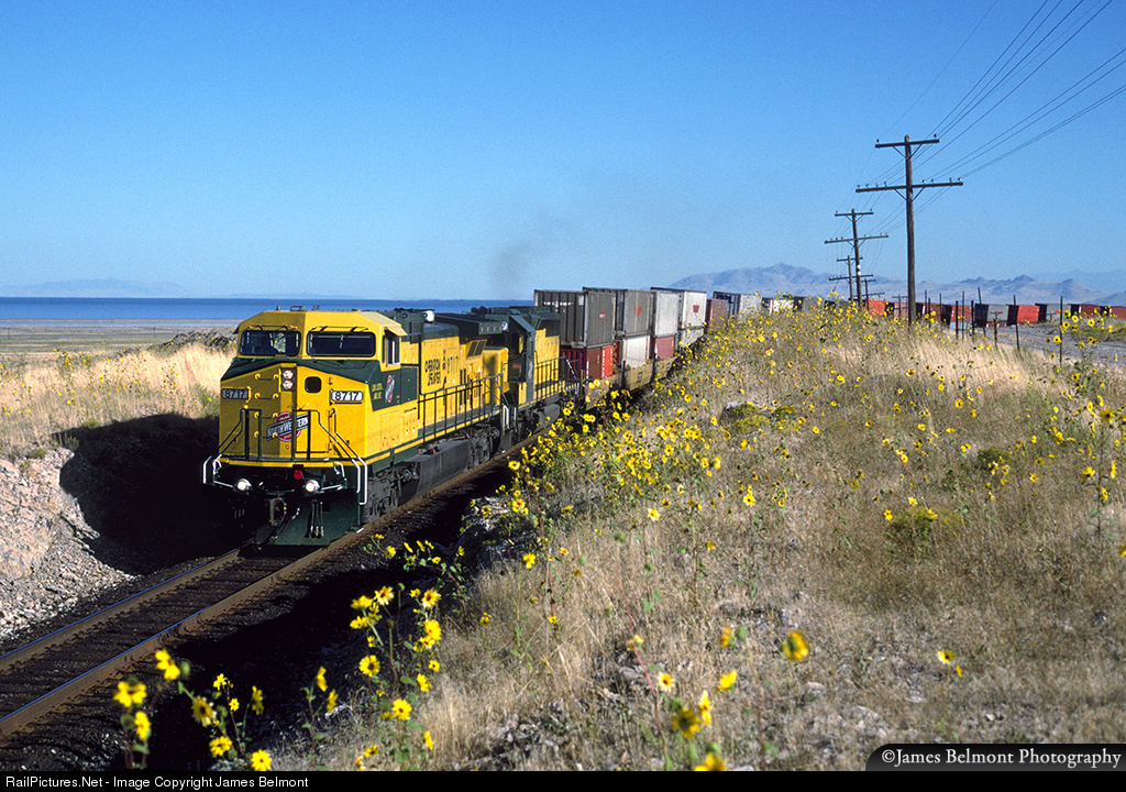 Chicago & North Western engines pull Union Pacific's APLA5 stack train through Erda, Utah on Sept. 24, 1995. Promontory Point, Antelope Island, and the Great Salt Lake are in background on this beautiful early fall morning.