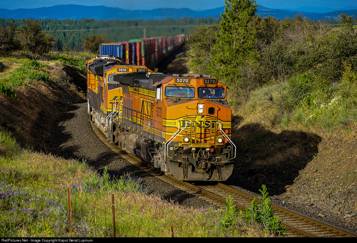 “Lions at Lyons” ~ Its roar can be heard many minutes before coming into sight: pounding, literally slogging up the grade just west of Spokane Washington on the old Great Northern Railway mainline, a long and loaded Emerald City bound BNSF Railway double-stack hits the curve with all its might at the east end of Lyons, milepost 1489.8, (miles from Minneapolis-St. Paul, the historic headquarters of James Jerome Hill’s - aka the “Empire Builder” - Great Northern Railway) but not before ducking under the old but faithful humpbacked wood bridge - just outside the frame - that lifts Euclid Road up and over the three General Electric and one Electro-Motive Diesel locomotives-in-charge as they expend every ounce of their combined continuous tractive effort of 472,000 pounds and 17,500 horsepower upon the ribbon rail and concrete ties (aka sleepers) betrayed by the exhaust heat waves that distort the train. One can only wonder what the one-eyed visionary Hill would think of how his “Empire” has grown and prospered under the contemporary visionary and modern-day empire builder, Warren Buffett. ▪ Locomotive details: BNSF 5270 C44-9W, BNSF 3810 ET44C4, BNSF 9105 SD70Ace, and BNSF 4130 C44-9W ▪ GPS details: 47.686874,-117.571324