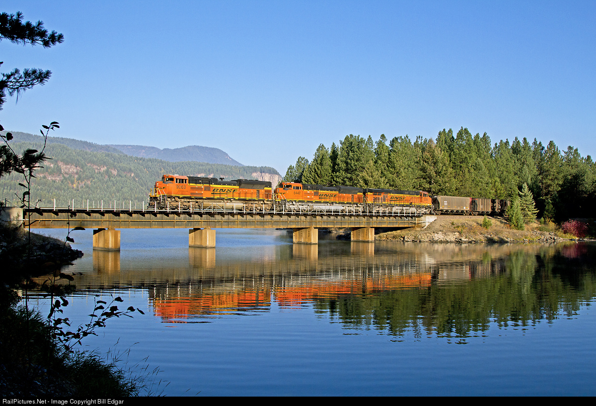 | BNSF 9263 leads an empty coal train east over the bridge at the west end of Tuscor siding on Montana Rail Link. The Clark Fork is in the background. The train is returning to the Powder River Basin from Centralia, WA. |
