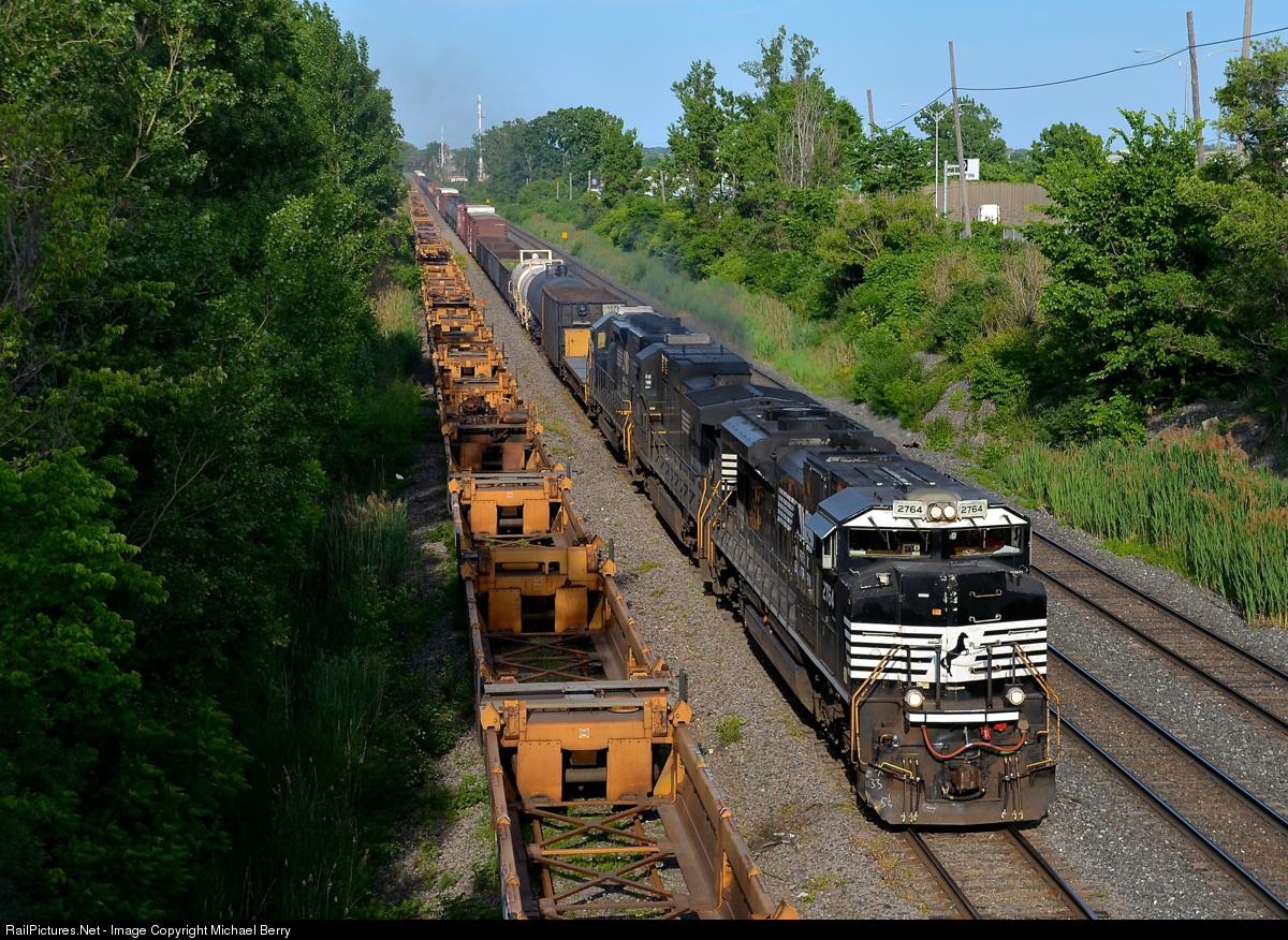 | A nice NS lashup in Montreal. CN 529 has a nice lashup consisting of SD70M-2 NS 2764, C40-9 NS 8858 & SD40-2 NS 6137 as it approaches Taschereau Yard where it will terminate. At left is a long string of stored well cars. |