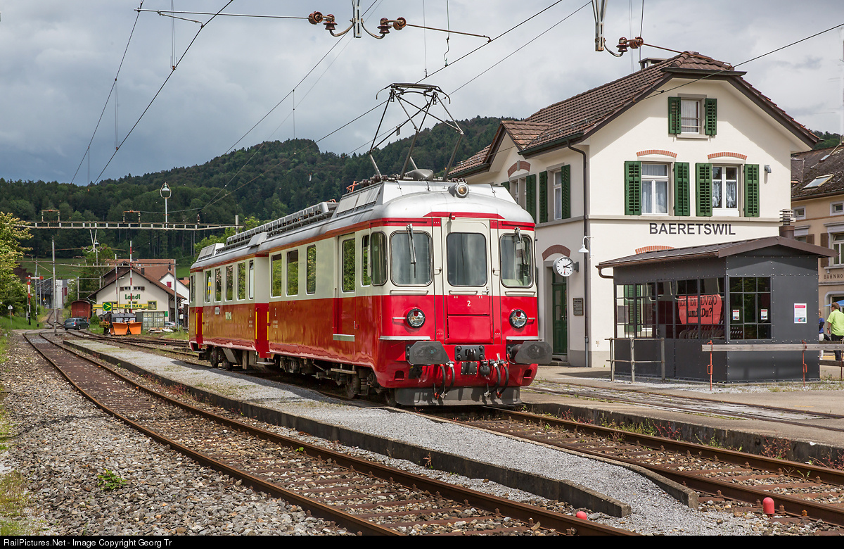 | Electric railcar BDe 4/4 # 2 of the former Wohlen-Meisterschwanden Bahn (WM), built in 1966 and in service on this only 8.2 kilometer long line till 1997. From then till 2004 running for the Südostbahn, now with Depot und Schienenfahrzeuge Koblenz (DSF). The railcar is on a birthday charter trip over the line (Hinwil-) Bäretswil-Bauma of the DVZO and made a photo stop in the beautiful restored station of BAERETSWIL (built in 1901 by the Uerikon-Bauma Bahn UeBB) of the DVZO (association steam railway Zürcher Oberland). |