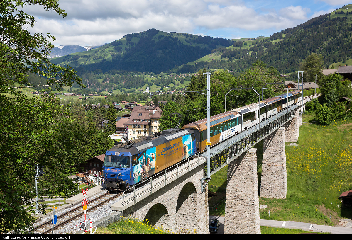 Ge 4/4 # 8004 in the Goldenpass paint scheme is pulling train 3115 GOLDENPASS PANORAMIC from Zweisimmen to Montreux over the viaduct at Gstaad.