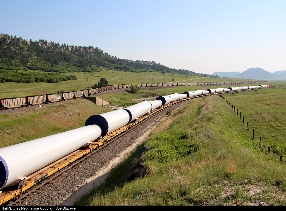 Northbound UP wind generator tower train on main two was heading into the morning sun adjacent Spruce siding on main one where a southbound BNSF coal load was waiting for it's passage. At this point the tower train is on both the exDRGW and exSanta Fe lines as this is where Santa Fe used to cross over the DRGW via a bridge before lines were connected forming todays Joint Line.