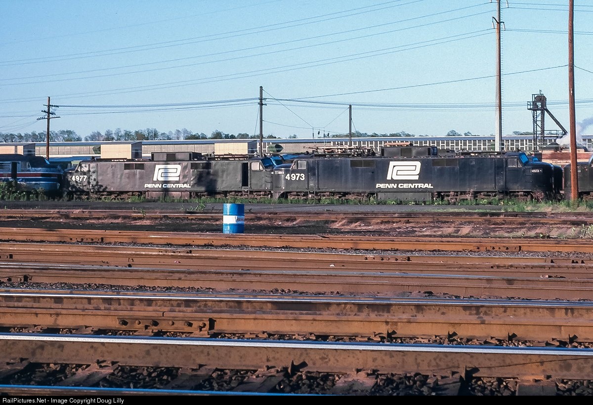 In 1969, the New Haven was folded into the year-old Penn Central, and changes to the jets soon followed. Reclassed E40, the six serviceable double-ended units remained in passenger service until a 1973 fire caused them to be banished from New York’s Park Avenue tunnel. The PC reassigned them to freight service, with two operating until shortly before this photo was taken in May, 1978. I believe that all six remaining E40’s were here at the Harrisburg engine terminal at the time of the photo. Beside the 4973 and 4977, another unit is coupled to the 4973, and a fourth one’s nose is visible between the two coupled units. All six E40’s were scrapped.