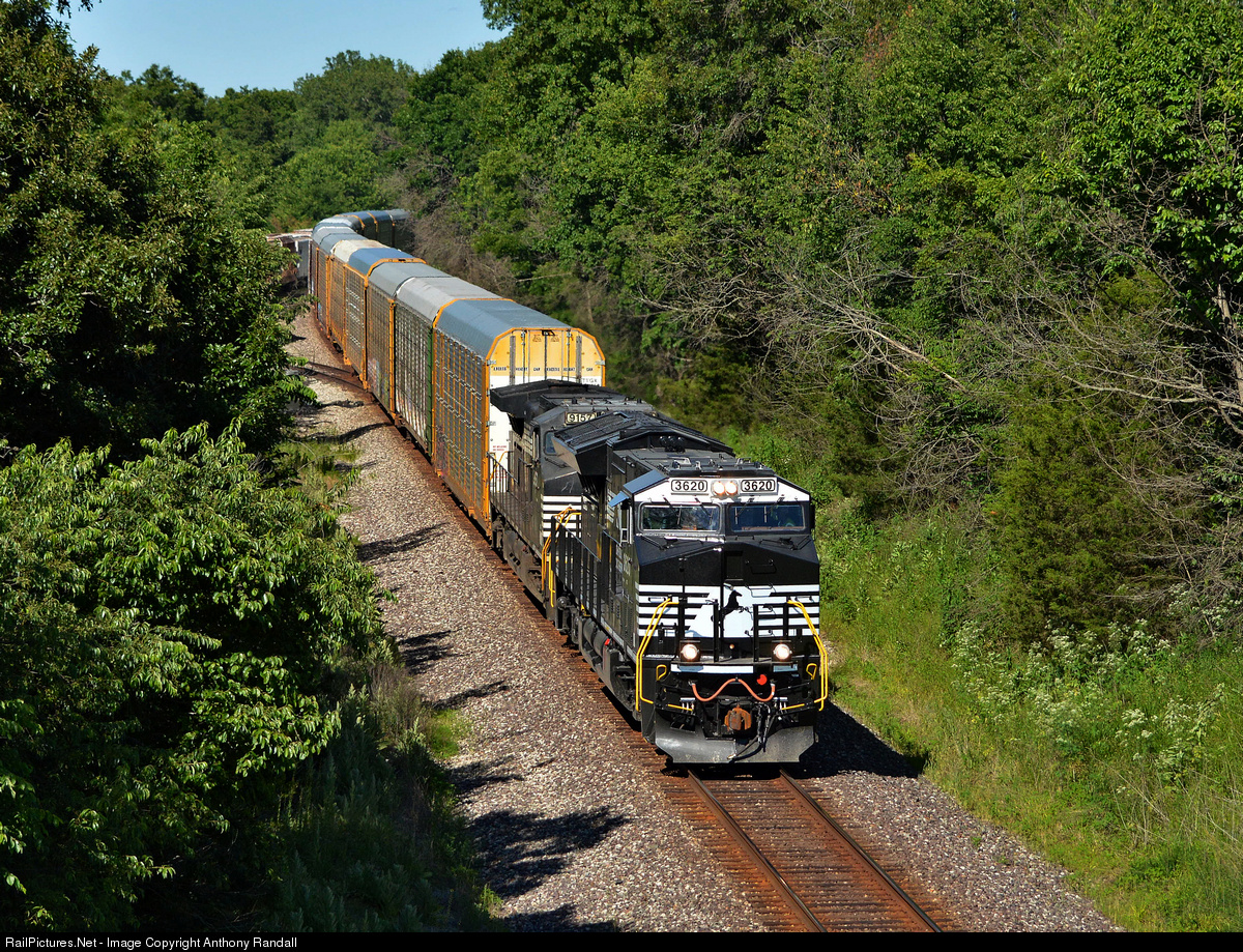 | The first Norfolk Southern ET44AC to visit Missouri, NS 3620, leads 239 west through Clifton Hill. |