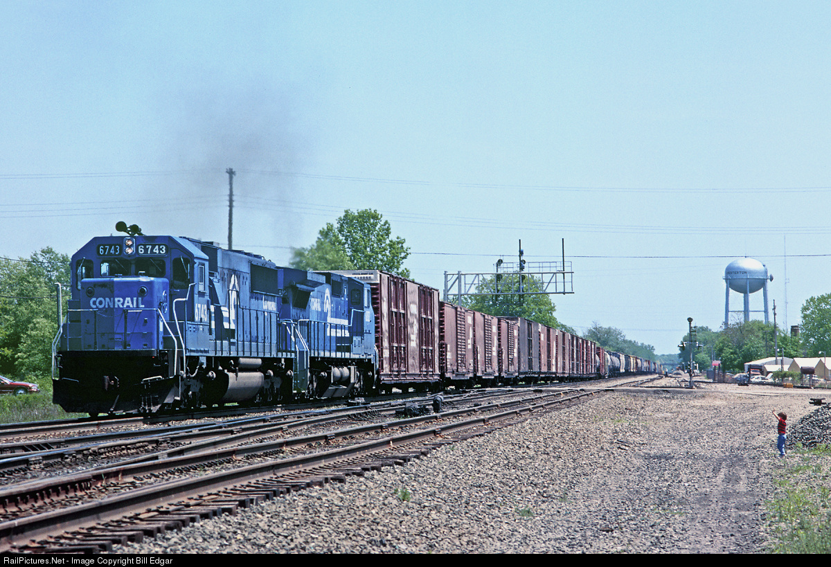 A Conrail freight heads west from Chesterton through Porter on its way from Elkhart, IN to Chicago. The manifest features a group of auto parts cars on the head end. Son Robert, not quite three at the time gives the crew a wave.