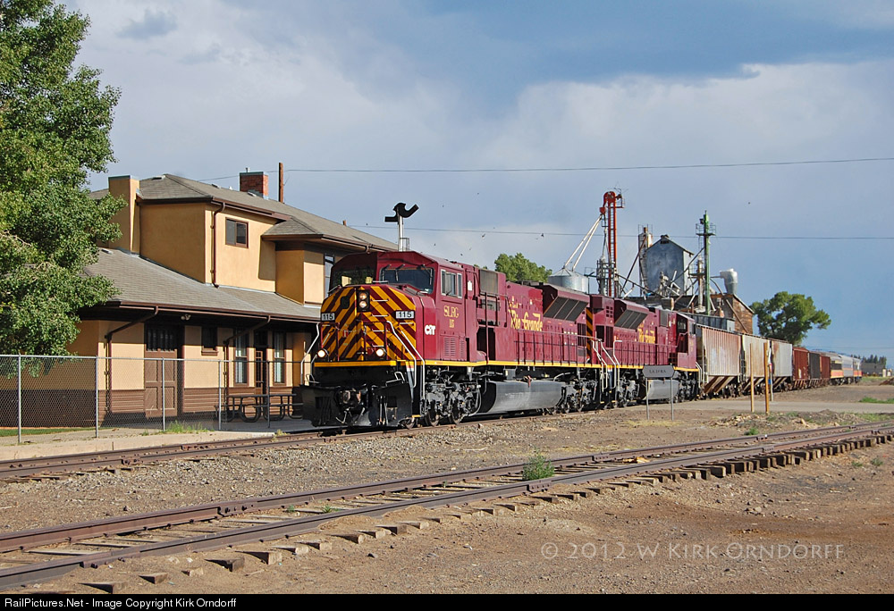 | The San Luis & Rio Grande south local passes the famous Denver & Rio Grande two-story depot in downtown La Jara, CO. The depot hasn't been used for passenger service since the 'San Juan' stopped running, but seeing some passengers pass the depot on the rear of the train was still a nice sight. |